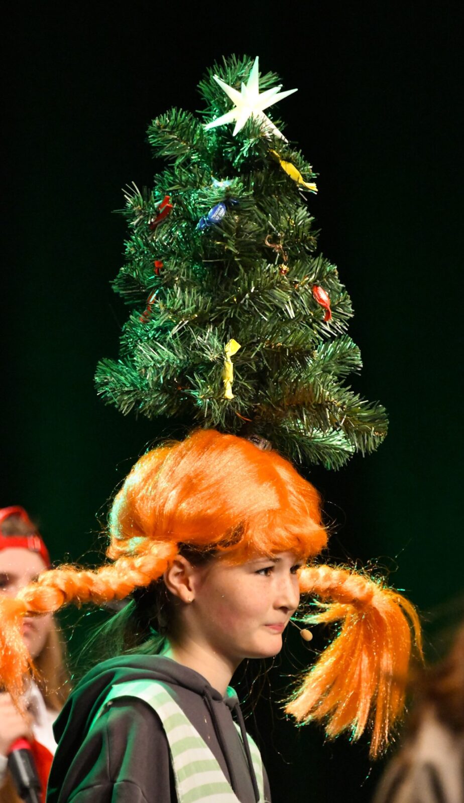 Nebenstehendes Bild zeigt Sophia Huber als Pippi Langstrumpf mit Weihnachtsbaum beim Winterkonzert 2024.