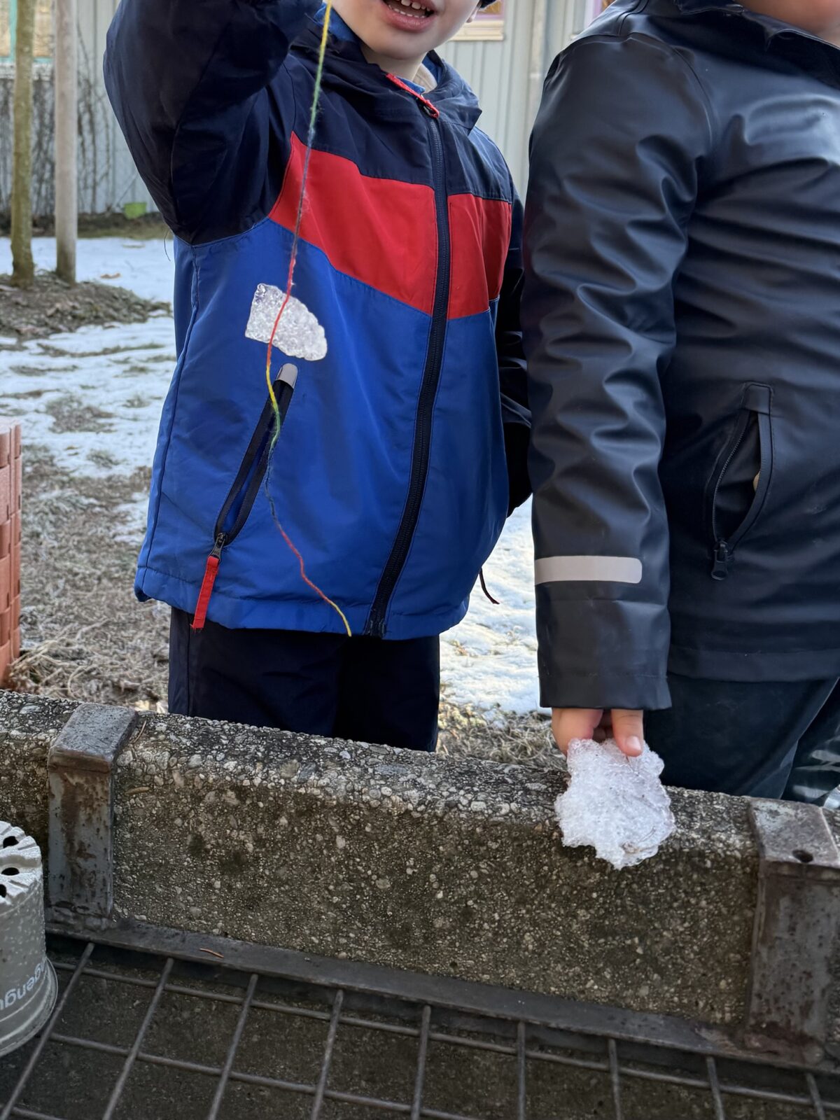 Im Rahmen unserer MINT-Erziehung (Mathematik, Informatik, Naturwissenschaften und Technik) haben die Kinder die Möglichkeit, in Kleingruppen selbst zu forschen, zu beobachten und auszuprobieren. Dabei steht nicht das Ergebnis im Vordergrund, sondern das Entdecken mit allen Sinnen: Fragen stellen, Vermutungen äußern, gemeinsam Lösungen finden und staunen, was alles passiert. Am vergangenen Dienstag fand das Experimentieren draußen statt – perfekt passend zu den kalten Temperaturen. Der Winter wurde kurzerhand zum Forschungslabor!