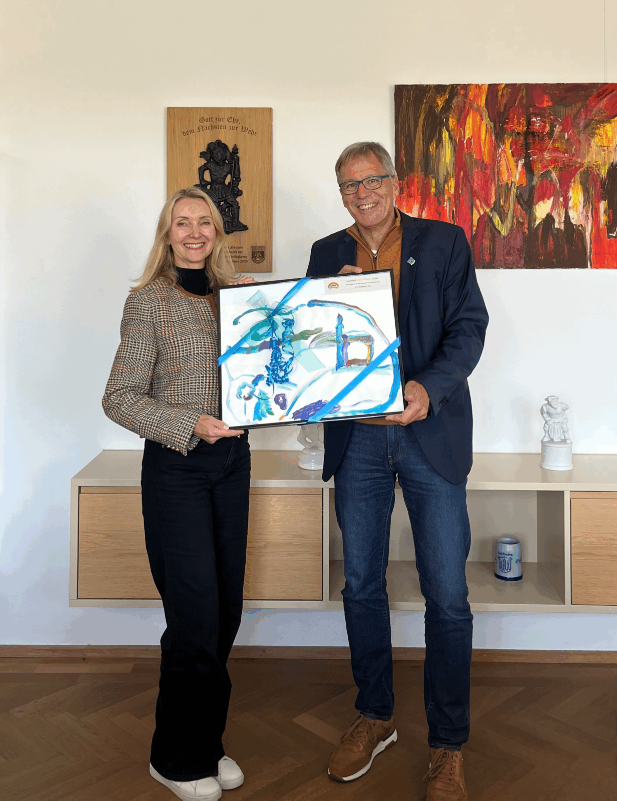 Bürgermeister erhält Kunstwerk von der Kita Regenbogen aus dem Kunstprojekt „Unser kunterbuntes Jahr“